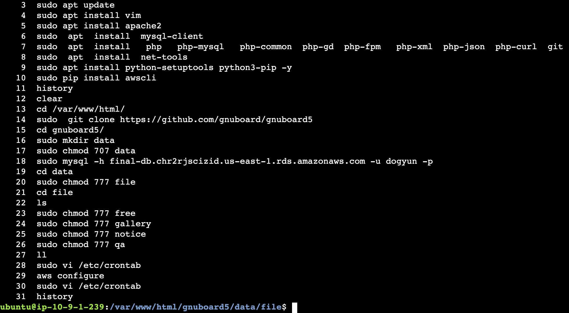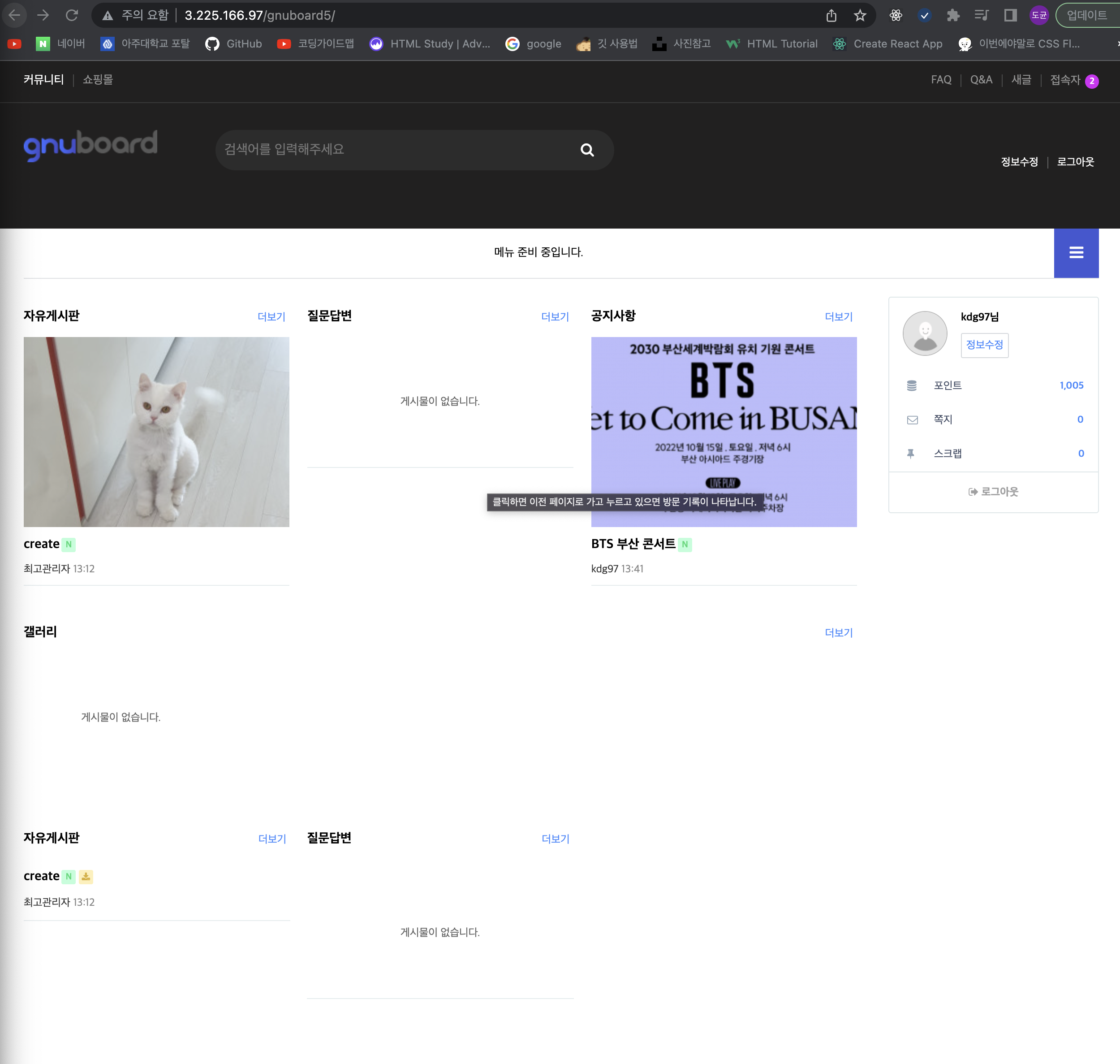 - 탄력적 아이피로만 들어갔을 시 아파치 서버가 그대로 나와 서버에 따른 취약점 공격이 수월할 것 같다 (그누보드를 root경로에 못 넣었다.)