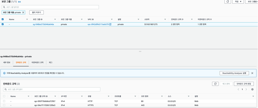 Private Subnet의 경우 80, 443포트만 열어주었다.