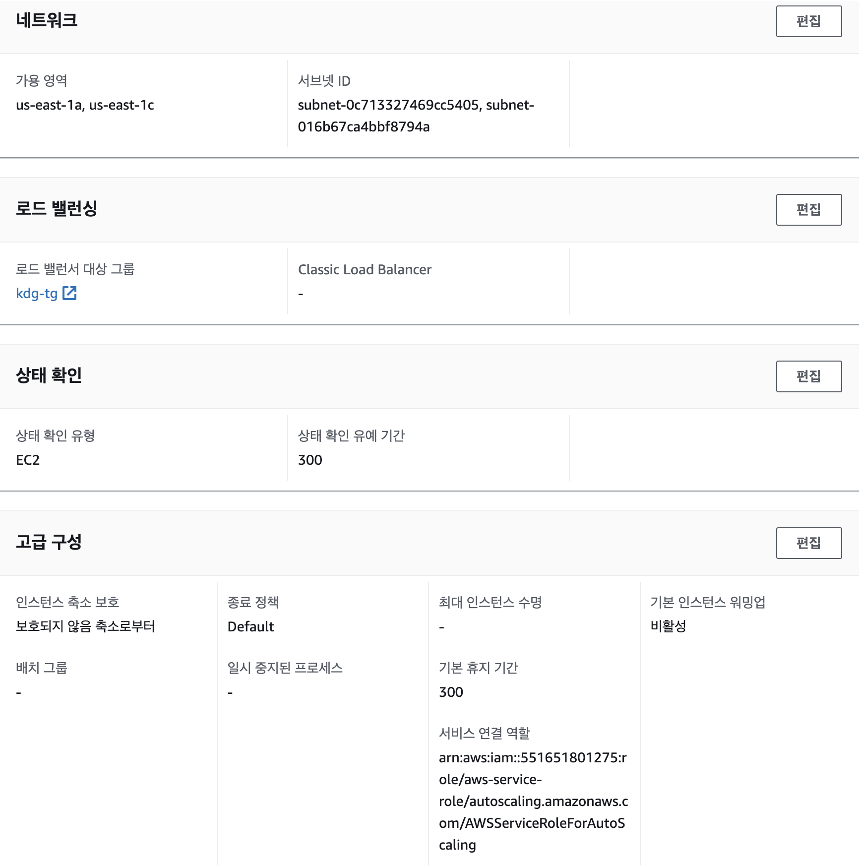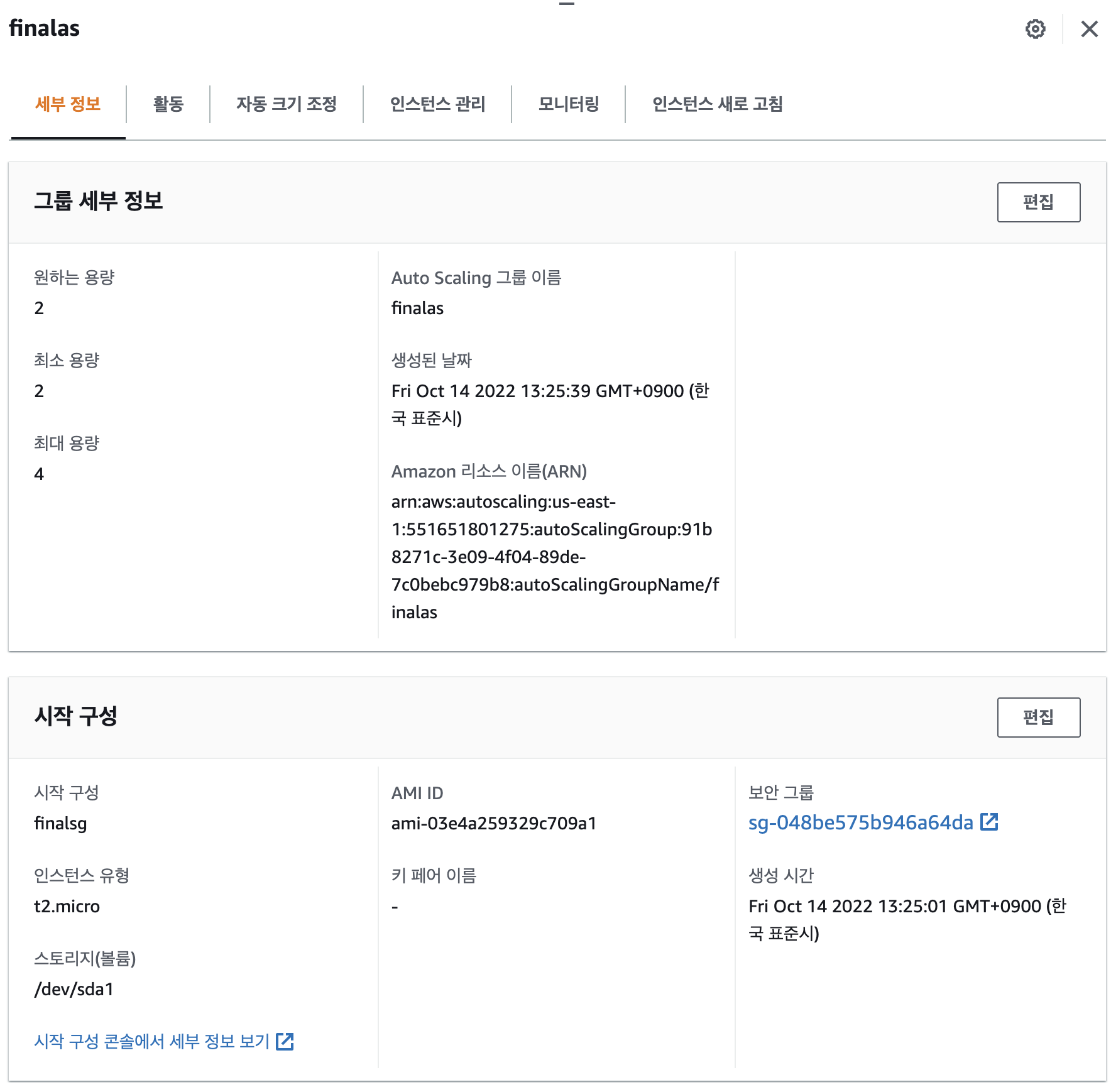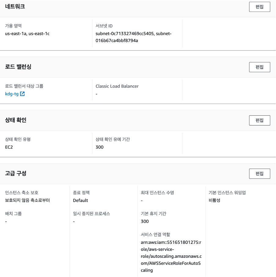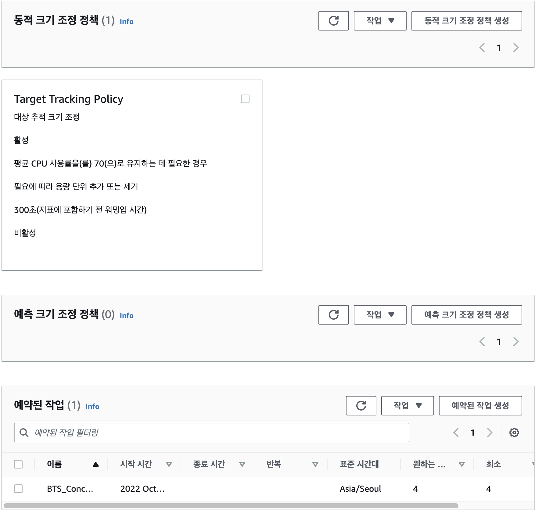 앞서 만든 Private Subnet 2개에 생성하도록 가용영역을 설정했고, BTS 팬페이지라는 가정을 하여 BTS콘서트 당시에 크기조정이 되도록 설정했다.