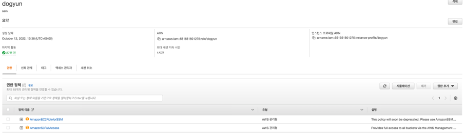 SSM을 사용하여 로그를 남기기위해 SSM, S3의 정책을 연결하여 권한을 생성했다.